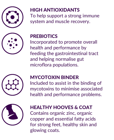 High energy feed designed for racing, harness racing and high performance horses in full work