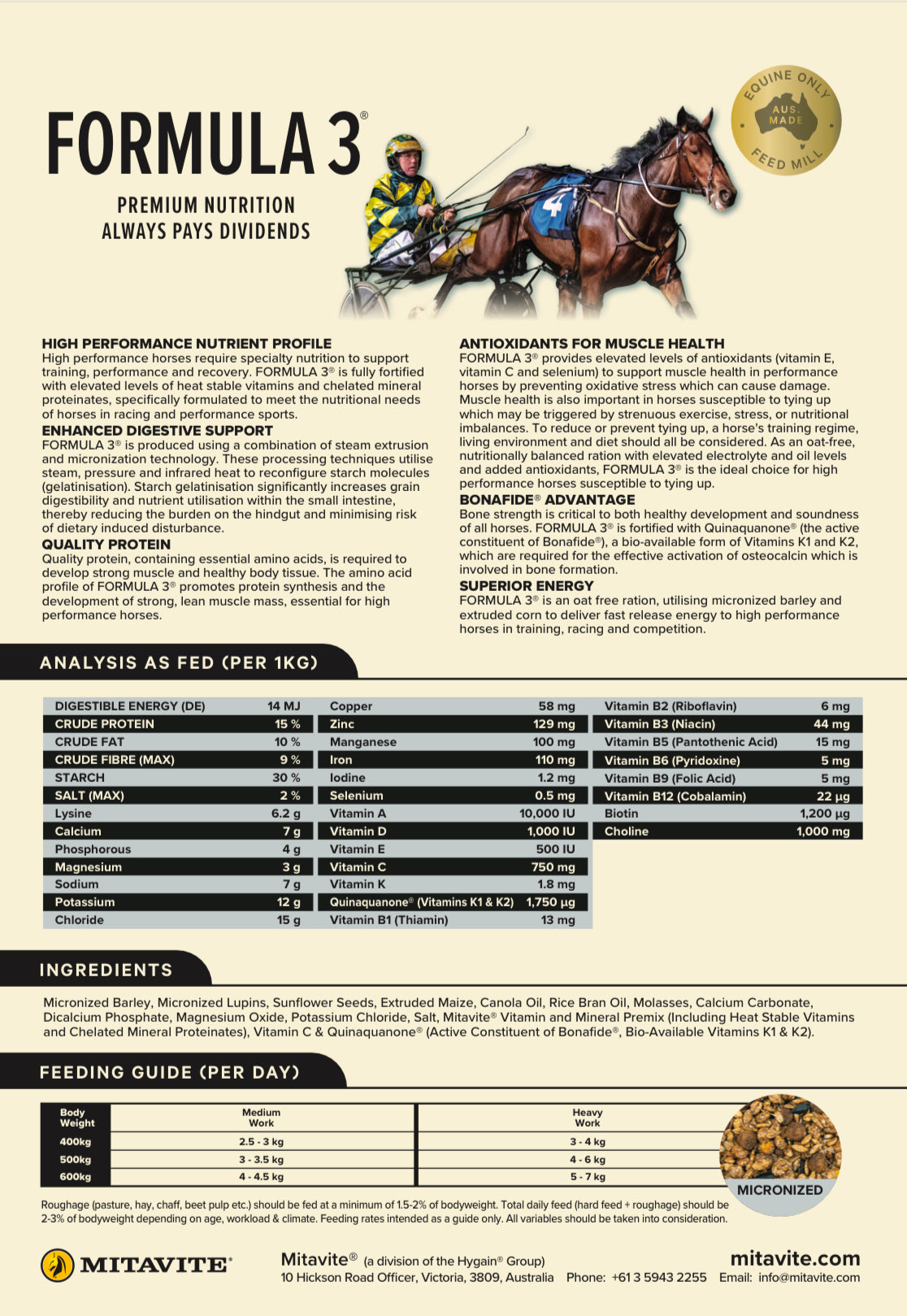 Micronized Barely, Micronized Lupins, Sunflower Seeds, Extruded Maize, Canola Oil, Rice Bran Oil, Molasses, Calcium Carbonate, Dicalcium Phosphate, Magnesium Oxide, Potassium Chloride, Salt, Mitavite® Vitamin and Mineral Premix (Including Heat Stable Vitamins and Chelated Mineral Proteinates), Vitamin C & Quinaquanone ® (Active Constituent of Bonafide®, Bio-Available Vitamins K1 & K2).